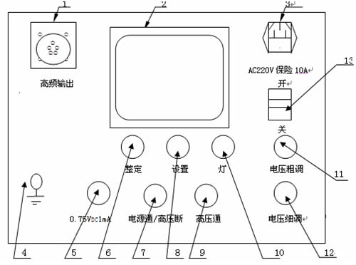 ⑼ 紅色帶燈按鈕、高壓接通按鈕、高壓指示燈:在綠燈亮的狀態下,按下紅色按鈕后,紅燈亮綠燈滅,表示高壓回路接通。此時可升壓。此按鈕須在電壓調節電位器回零狀態下才有效。如按下紅色按鈕紅燈亮,綠燈仍亮,但松開按鈕紅燈滅綠燈亮,表示機內保護電路已工作,此時必須關機檢查過壓整定撥盤開關是否小于滿量程的5%及有無其它故障,檢查無誤后再開機。